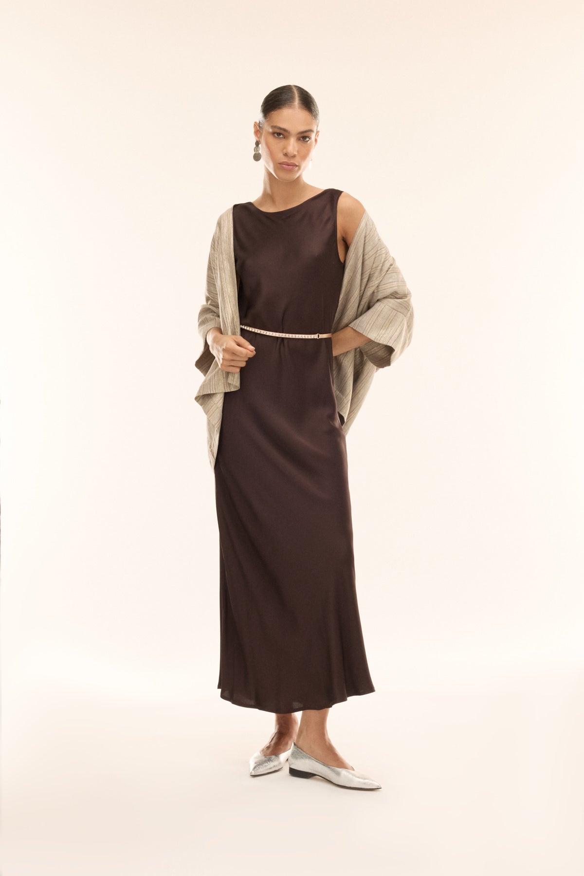 Deze lange jurk is uitgevoerd in soepel viscose satijn en voelt licht en elegant aan op de huid. De open rug voegt een verfijnd, vrouwelijk accent toe, terwijl de vloeiende snit zorgt voor een moeiteloze uitstraling. Een tijdloos silhouet dat moeiteloos balanceert tussen elegantie en draagcomfort.